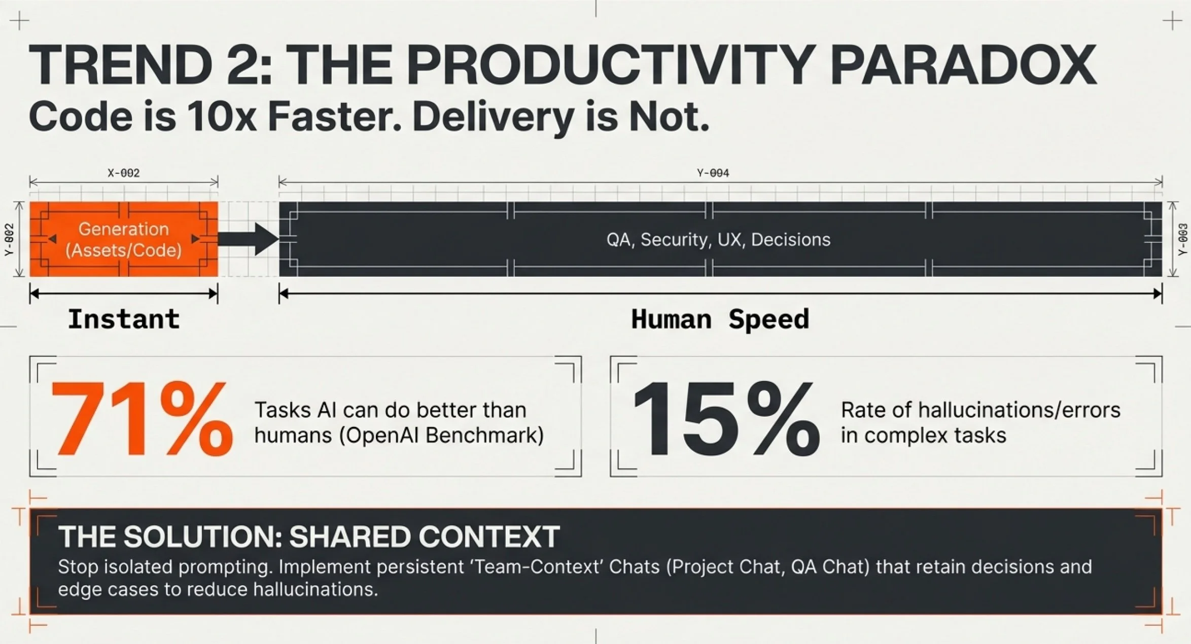 Because the bottleneck has shifted. The constraint is no longer "writing the code." The constraint is now decision-making, quality assurance (QA), legal review, security compliance, and organizational alignment. We have built a Ferrari engine (AI coding) and put it inside a horse-drawn carriage (legacy management).