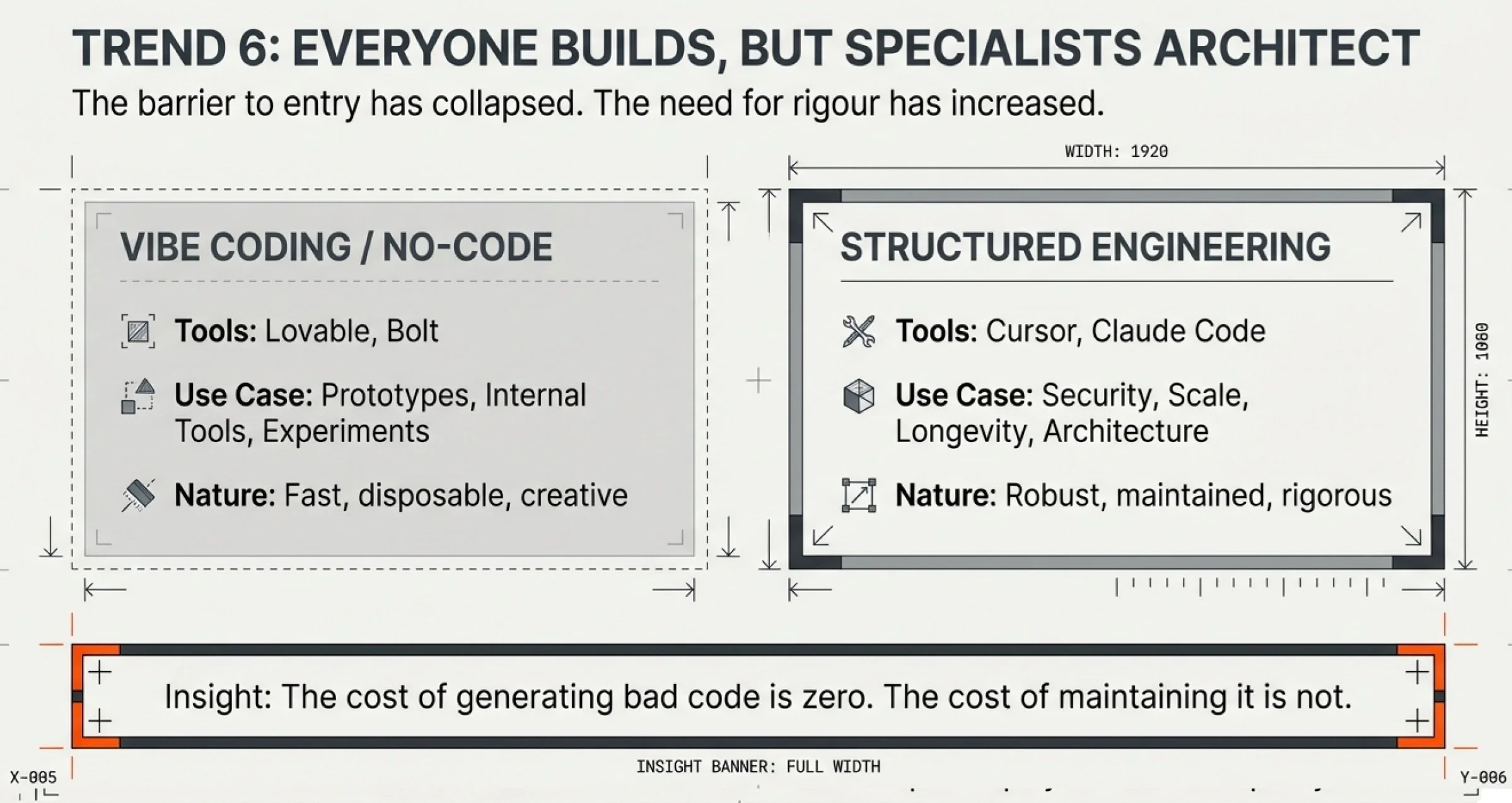 The Insight: Vibe coding is perfect for Discovery. It allows non-technical people to validate ideas, build internal tools, and create prototypes without waiting for engineering resources.