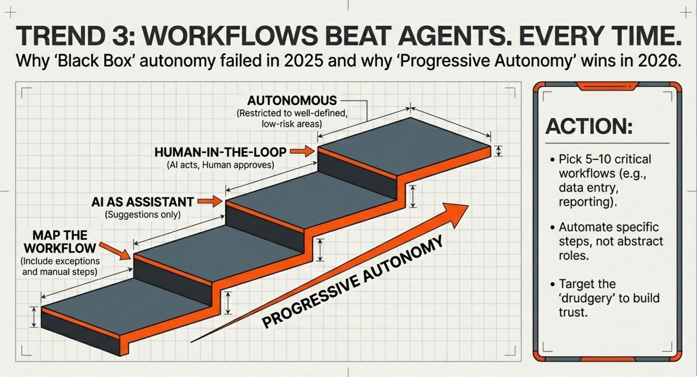 In 2026, the winning pattern is Workflow Automation with Progressive Autonomy.