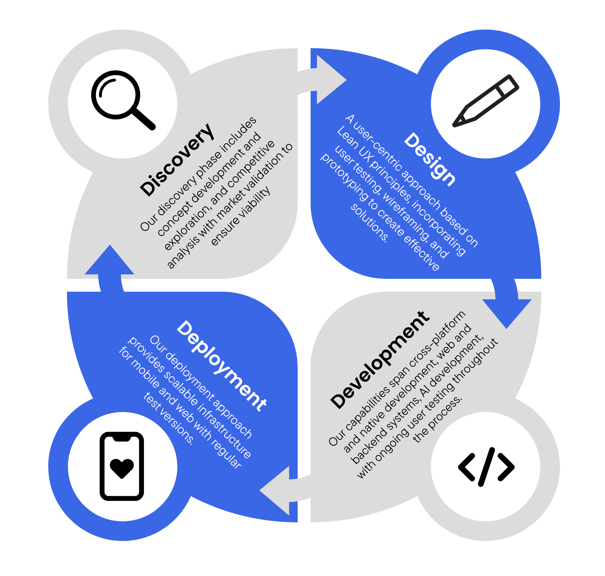 Our approach integrates strategic thinking with execution efficiency: clients receive wireframes within days, functional prototypes within weeks, and market-ready products within months.
